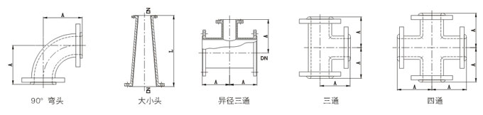 注:1)當通徑DN≥300mm時,屬設(shè)備類。2)若系負壓狀態(tài)下使用,請訂貨時加以說明,則按耐負壓工藝襯里施工。3)法蘭若無特殊要求,則按HG20592-97的規(guī)定,詳見附錄。4)各通用管配件的參數(shù)見表,其它非標件如偏心異徑管,異徑彎頭等可按用戶要求加工。